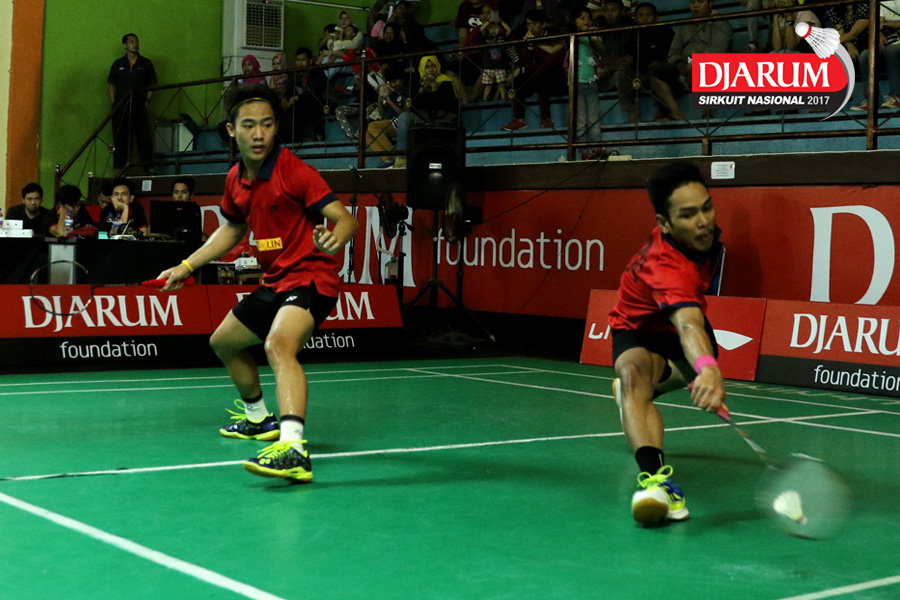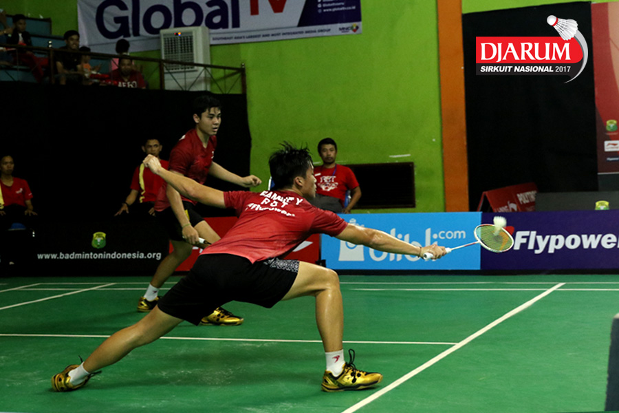 M Yusuf Maulana/Yonathan Ramlie (Mentari RBT) Berusaha Menggapai Shuttlecock