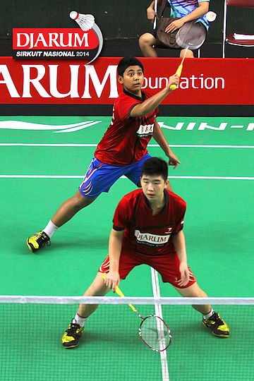 Danu Wandani/Indra Setiawan (Pertamina Indonesia) bersiap mengembalikan shuttlecock ke arah Rifky Faturrahman/Subhan Hasan (Jaya Raya)