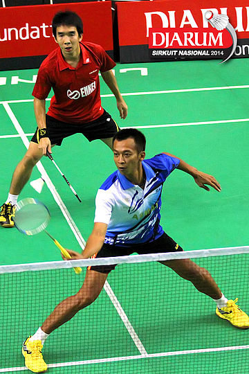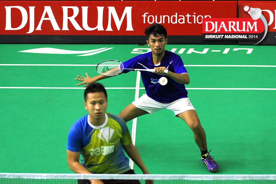 Lukhi Apri/Rafiddias Akhdan (Pelatnas) menghadang serangan yang dilepaskan Anggun Nugroho/Rio Wilianto (Halim/JR Enkei)