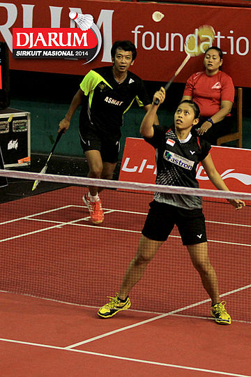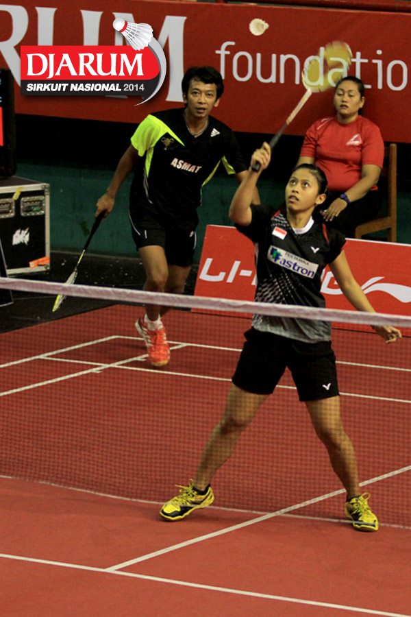 Ridho Akbar/Sri Wulan (Halim/Jaya Raya) mengembalikan shuttlecock ke arah Didit Juang/Deariska Putri (Djarum Kudus)