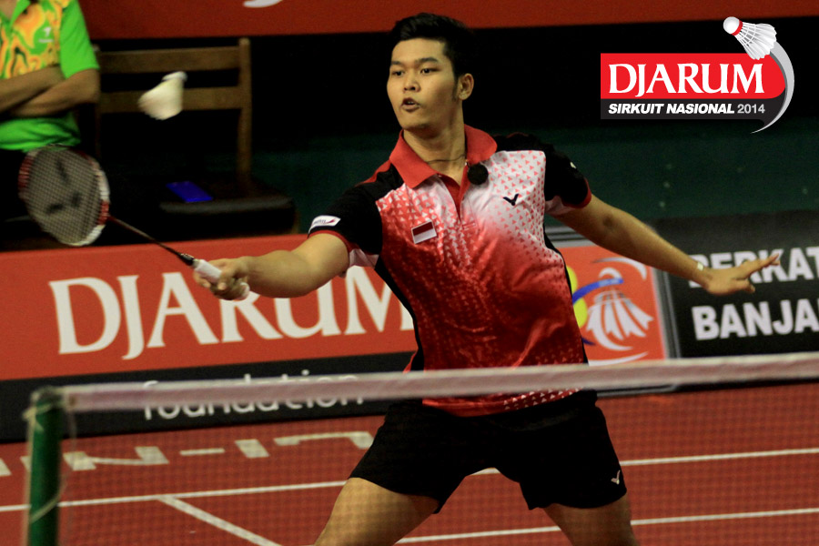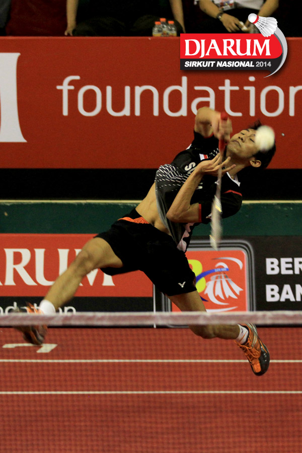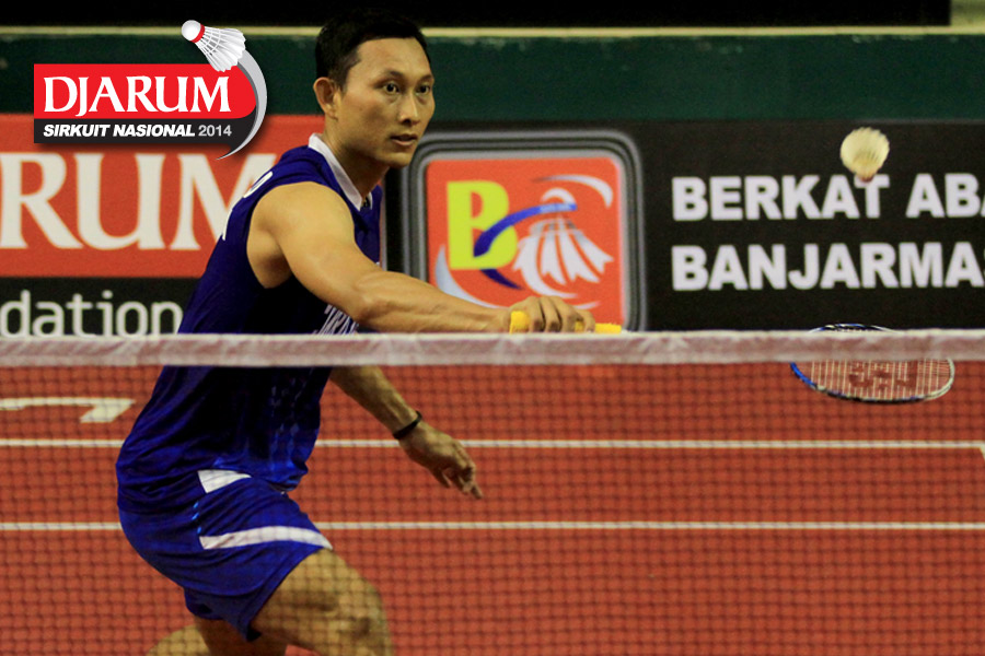 Sony Dwi Kuncoro (Tjakrindo Masters) mengembalikan shuttlecock ke arah Alvindo Saputra (Tangkas)