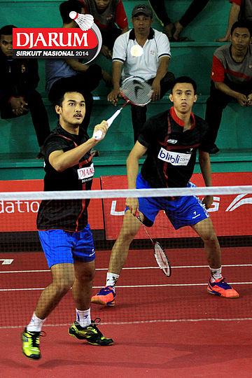 Angger Sudrajat/Tedi Supriadi (Djarum Kudus) bersiap menyambut pengembalian dari Andrean Syahputra/Rezky Akbar (Hi Qua Wijaya)
