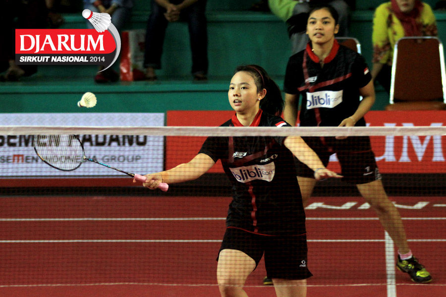 Della Augustia/Ristya Ayu (Djarum Kudus) mengembalikan shuttlecock ke arah Nana Hidayati/Rani Wahyuni (PBSI Bukit Tinggi)