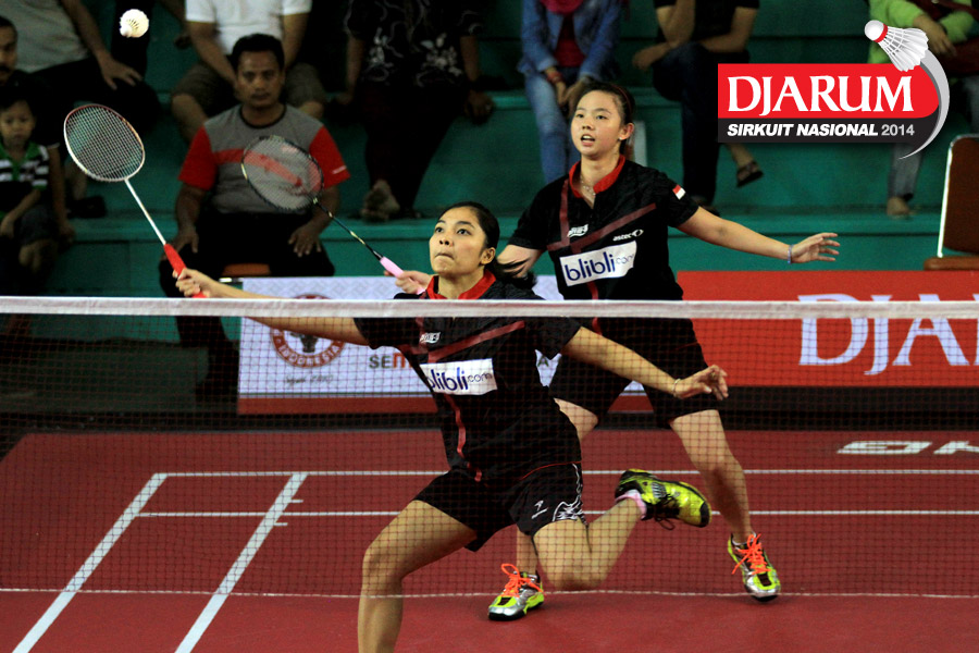 Deariska Putri/Sri Wulan (Djarum Kudus/Jaya Raya) menghadang serangan yang dilepaskan Jessica Muljati/Yulia Yosephine (Shamrock Medan)