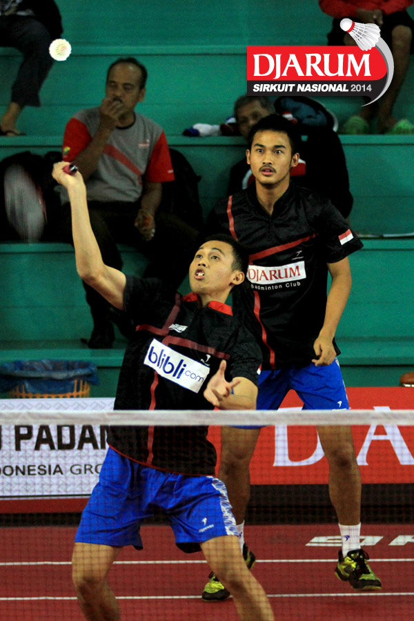 Akbar Bintang/Jeka Wiratama (Djarum Kudus) mengembalikan shuttlecock ke arah Ari Taufik/Randhi Reynaldi (SGS PLN)