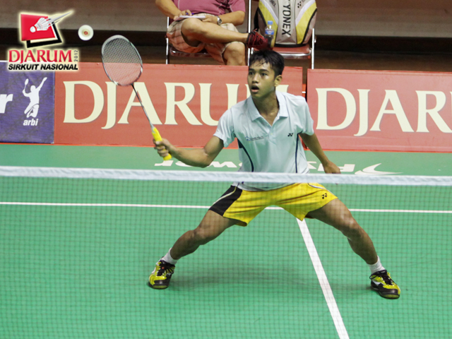 Kho Hendrikho (PB Djarum Kudus) melepaskan smash menyilang ke arah Abdul Muis (BKD Kaltim).