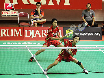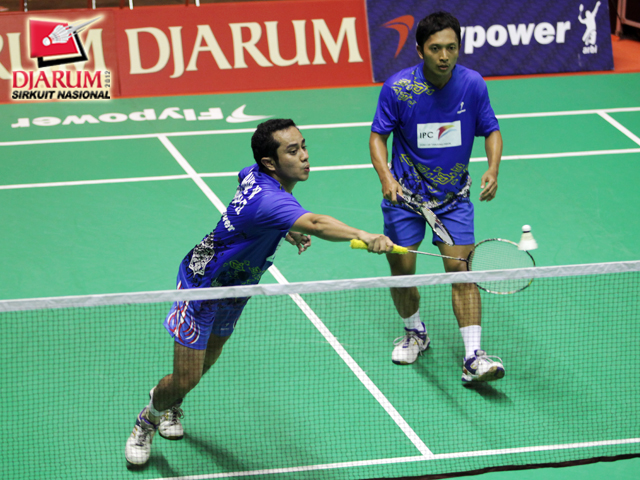 Shaibul Wafa/M. Asykuru (Pelabuhan II) menyambut serve dari Pasangan ganda putra dewasa PB Djarum Kudus, Rendra Wijaya/Rian Sukmawan.
