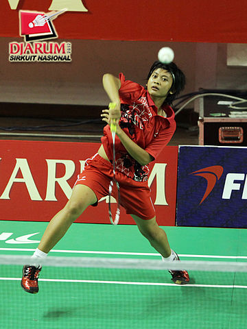 Berliyan Sudrajat (Semen Gresik) melepaskan drop smash ke arah Intan Dwi Jayanti (PB Djarum Kudus).