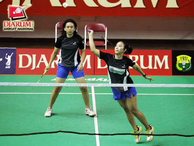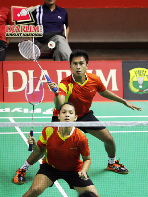 Rian Swastedian/Masita Mahmudin (Pusdiklat Jaya Raya) berusaha mengembalikan bola ke arah pasangan ganda campuran taruna PB Djarum Kudus, Ricky Alverino/Febriani Endar.
