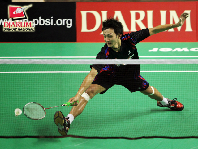 Ihsan Maulana (PB Djarum Kudus) berusaha menggapai drop smash dari Jonatan Christie (Tangkas Specs).