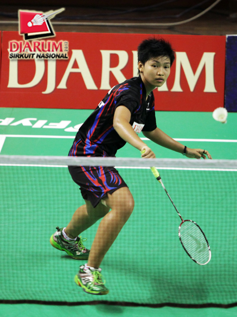 Intan Dwi Jayanti (PB Djarum Kudus) berusaha mengembalikan bola ke arah Berliyan Sudrajat (Semen Gresik).
