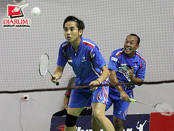 Sangaji (kiri) dan Clara asal PB Jaya Raya saat melepaskan serve.