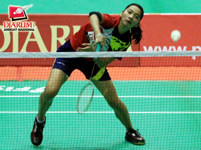 Pia Zebaidah Bernadet dari Pusdiklat Jayaraya sedang memukul kok untuk dikembalikan kepada lawannya, Ana Rovita dari Djarum Kudus.