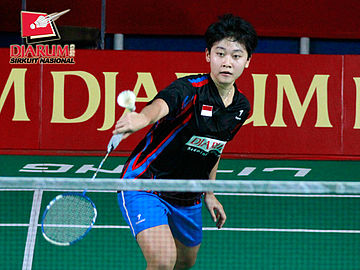 Marsa Indah (PB Djarum) mengembalikan kok ke arah Berliyan SUdrajat (Semen Gresik).