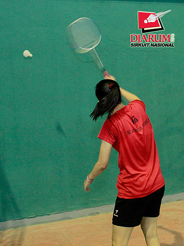 Vicky Rizky/Jessica Shohan (PB Djarum) bersiap menyambar pengembalian dari M. Yusuf/Zahrotun Khoirunisa (Hevindo).