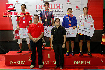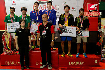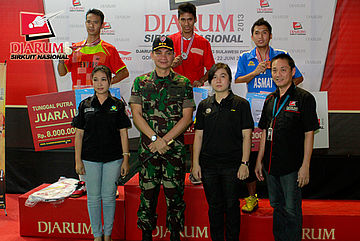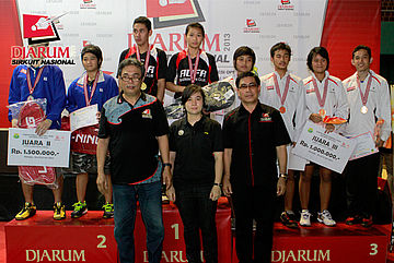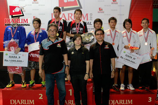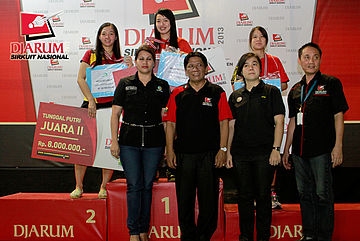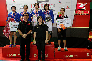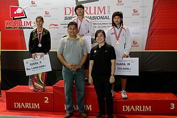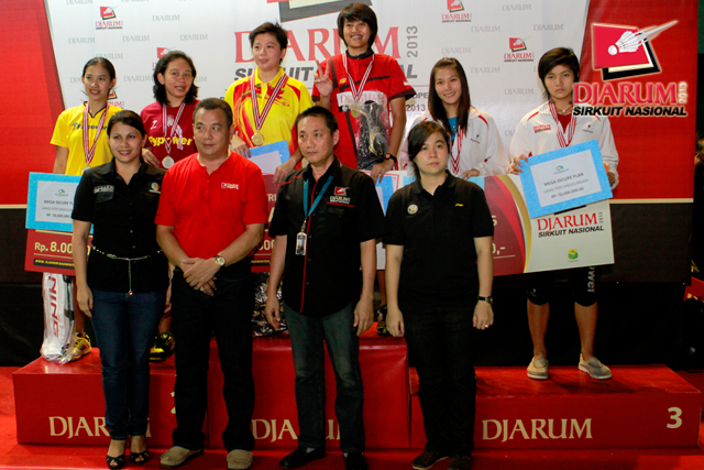 Febby Angguni, Ana Rovita dan Sylvinna Kurniawan berpose bersama di podium.