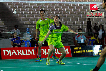 Abu Bakar/Tedi Supriadi (PB Djarum) bersiap mengembalikan shuttlecock ke arah Rajid Patriawan/Rino Ramadhika (Pelatprov DKI Jakarta).