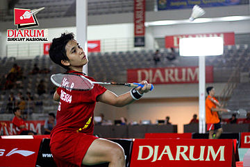 Mitzi Abigail (Sarwendah) gagal mengembalikan shuttlecock ke arah Arinda Sari Sinaga (PB Djarum).