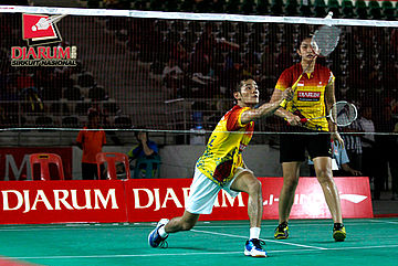 Darmiko/Deariska Putri (PB Djarum) mengembalikan shuttlecock ke arah Syarief Syahmie/Ery Octaviani (JR Enkei/Jaya Raya).