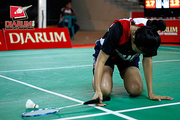 Selebrasi Arinda Sari Sinaga (PB Djarum) setelah berhasil mencuri poin dari Mitzi Abigail (Sarwendah).