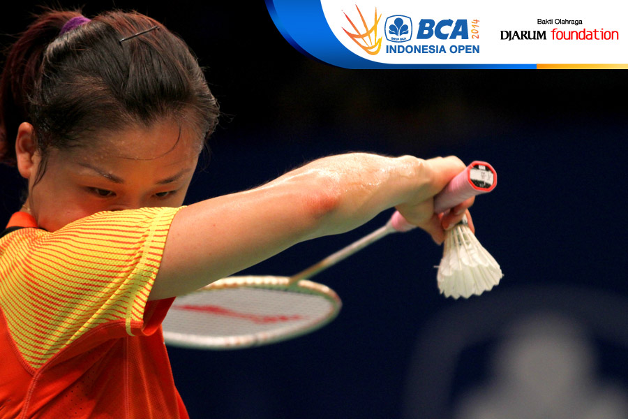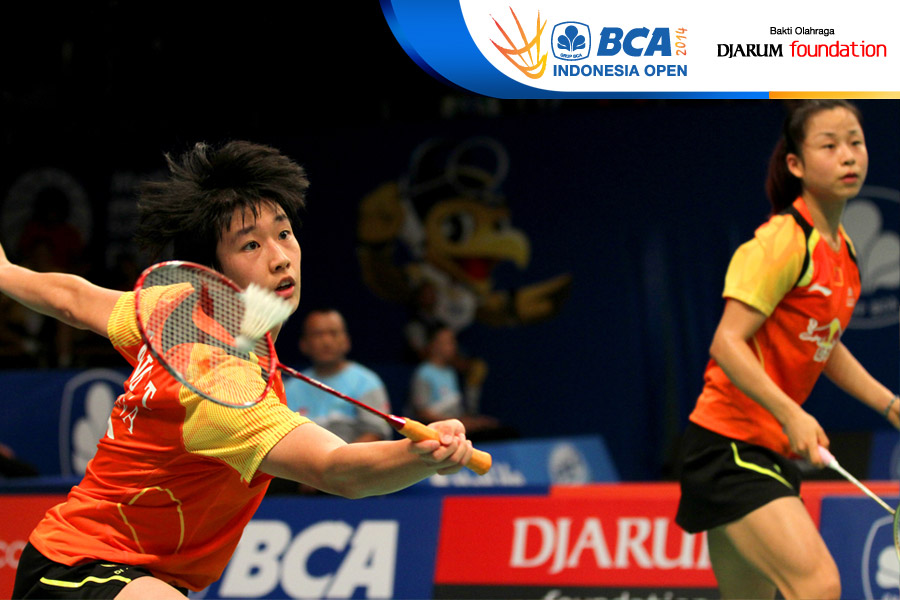 Ma Jin/Tang Yuanting (China) mengembalikan shuttlecock ke arah Shinta Mulia Sari/Yao Lei (Singapura)