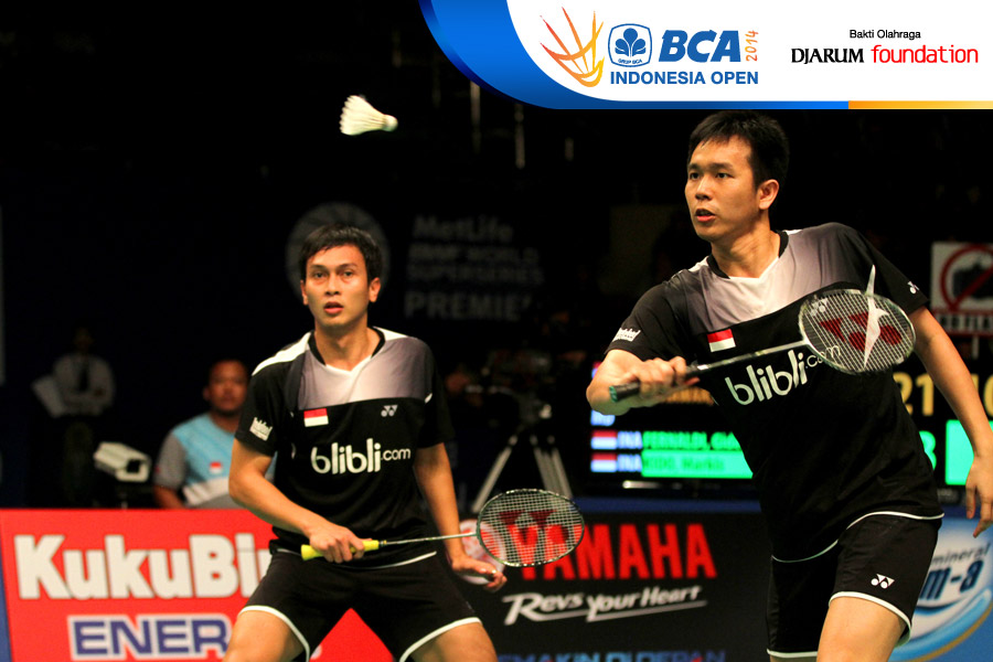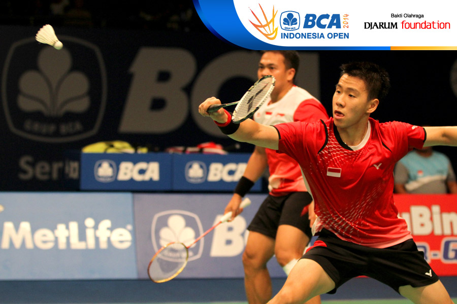 Markus Fernaldi Gideon (Indonesia) harus jatuh bangun menghadang serangan-serangan yang dilepaskan pasangan Hendra Setiawan/Mohammad Ahsan (Indonesia)