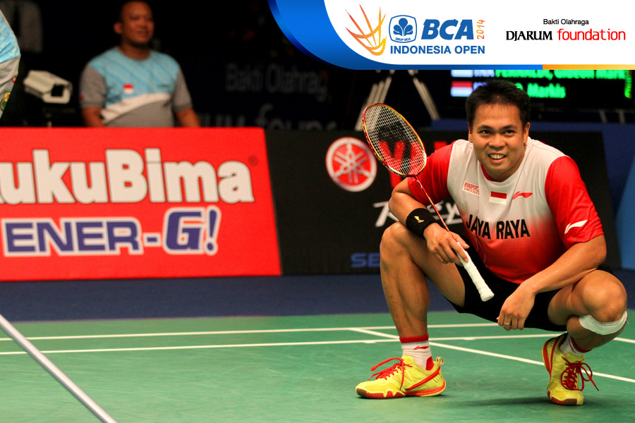 Selebrasi Markus Fernaldi Gideon (Indonesia) setelah berhasil mencuri poin dari pasangan Hendra Setiawan/Mohammad Ahsan (Indonesia)