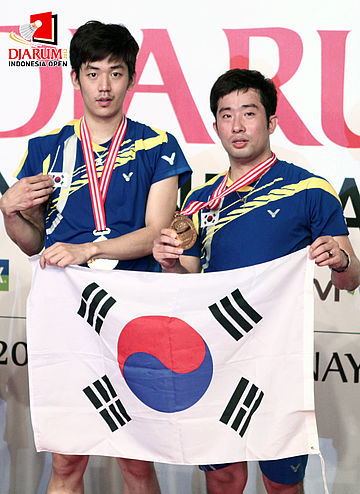 Jung Jae Sung/Lee Yong Dae berpose dengan memegang bendera Korea Selatan ketika berada di podium juara.