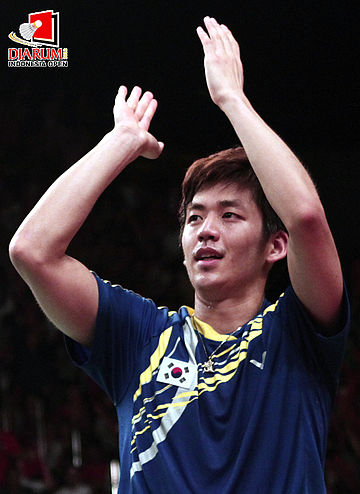 Selebrasi pemain Korea Selatan Lee Yong Dae, usai menang atas pasangan Denmark, Carsten Mogensen/Mathias Boe.
