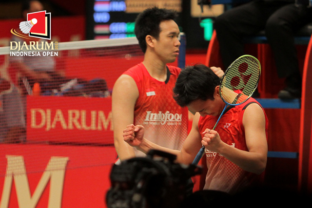 Selebrasi Mohammad Ahsan setelah berhasil mengalahkan pasangan Jepang, Hiroyuki Endo/Kenichi Hayakawa.