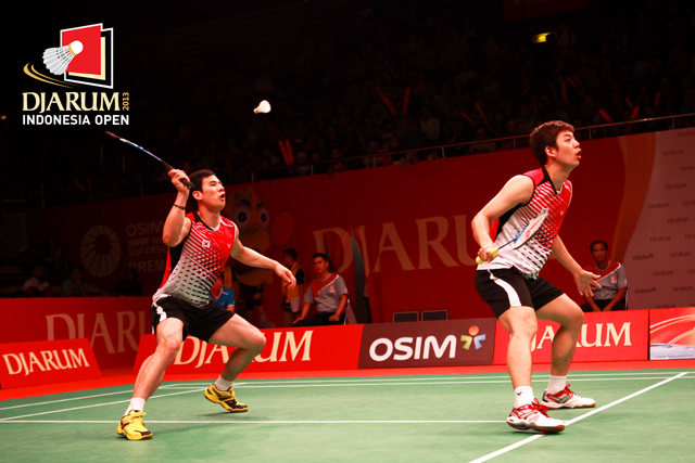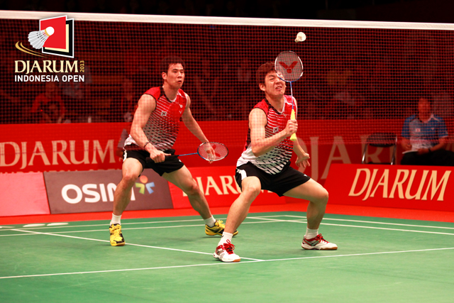 Ko Sung Hyun/Lee Yong Dae (Korea Selatan) bersiap mengembalikan shuttlecock ke arah pasangan Jepang, Hirokatsu Hashimooto/Noriyasu Hirata.