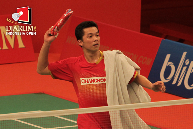 Taufik Hidayat (Indonesia) bersiap melemparkan merchandise kepada penonton.
