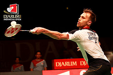 Marc Zwiebler (Jerman) mengembalikan shuttlecock ke arah Tommy Sugiarto (Indonesia).