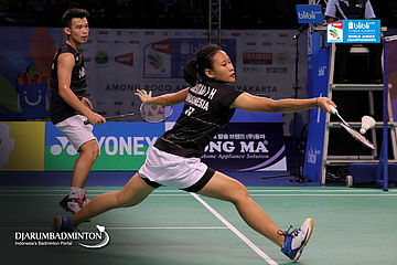 Rinov Rivaldy/Pitha Haningtyas Mentari (Indonesia) Mengembalikan Shuttlecock