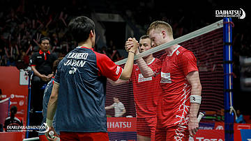 Kim ASTRUP/Anders Skaarup RASMUSSEN (Denmark) dan Takuto INOUE/Yuki KANEKO (Japan) bersalaman usai bertanding