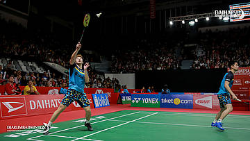 Marcus Fernaldi GIDEON/Kevin Sanjaya SUKAMULJO (Indonesia) mengembalikan serangan