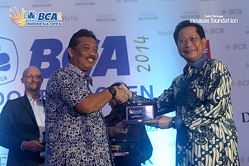 Presiden Direktur BCA, Jahja Setiaatmadja (kanan) saat memberikan cinderamata kepada perwakilan Pemprov DKI Jakarta