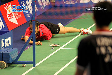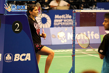 Ashwini Ponnappa (India) saat menunggu giliran untuk berlatih di Istora Senayan