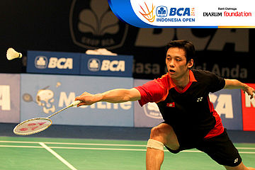 Simon Santoso (Indonesia) mengembalikan shuttlecock ke arah Hu Yun (Hongkong)