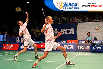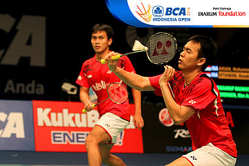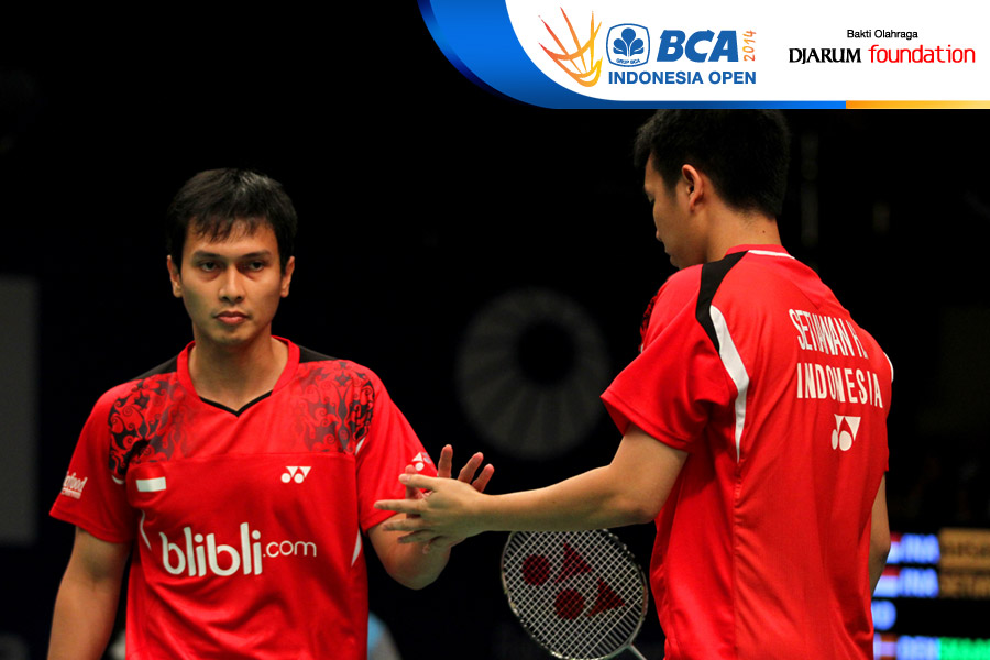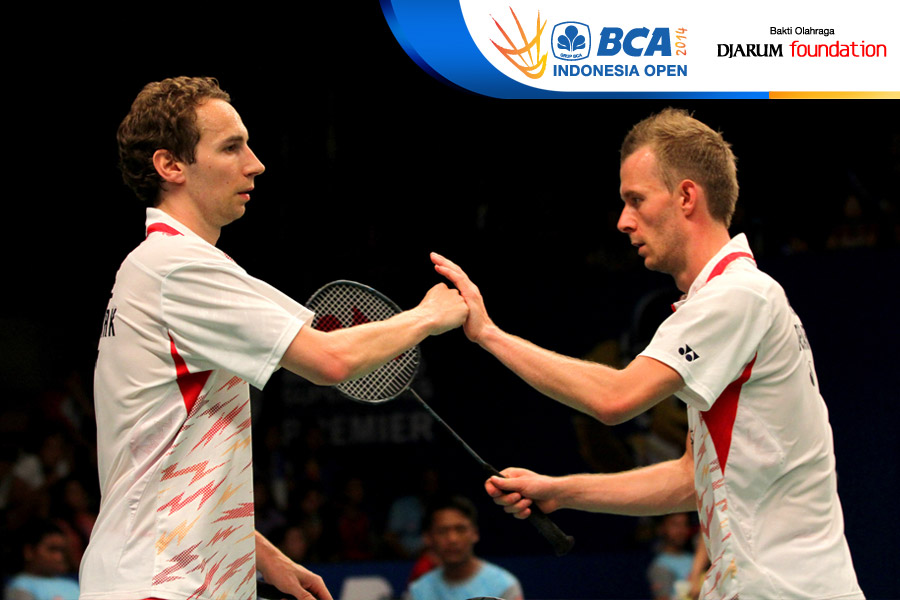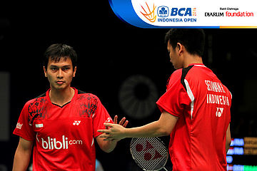 Kekompakan Hendra Setiawan/Mohammad Ahsan (Indonesia) di dalam lapangan saat melawan Andres Skaaruop Rasmussen/Kim Astrup Sorensen (Denmark)