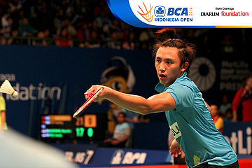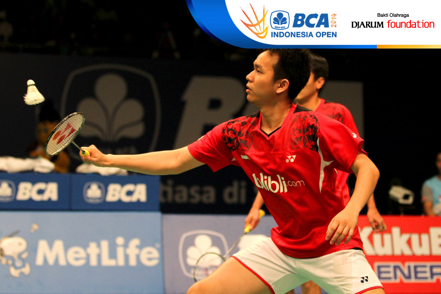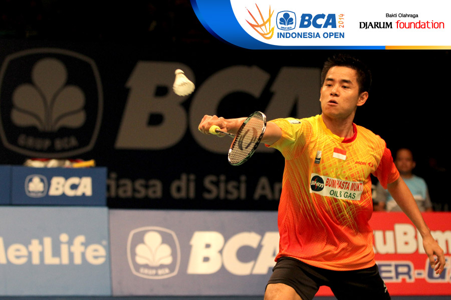 Hu Yun (Hongkong) mengembalikan shuttlecock ke arah Simon Santoso (Indonesia)