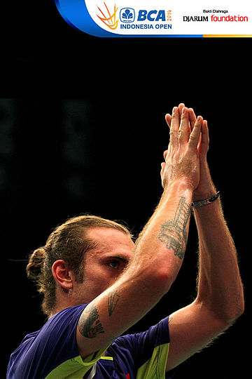 Jan O Jorgensen (Denmark) memberikan apresiasi kepada seluruh penonton BCA Indonesia Open Super Series Premiere 2014 yang telah mendukungnya