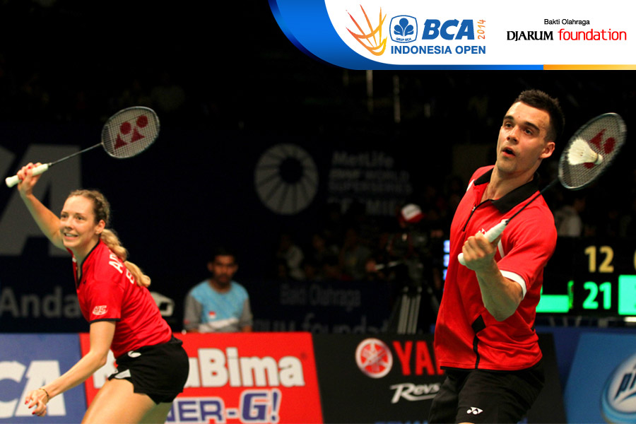 Chris Adcock/Gabrielle Adcock (Inggris) berhasil menghadang serangan yang dilepaskan Tontowi Ahmad/Liliyana Natsir (Indonesia)