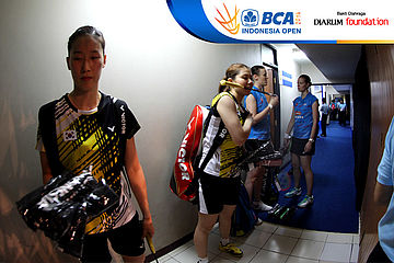 Jang Ye Na/So Young Kim (Korea) dan Christinna Pedersen/Kamila Rytter Juhl (Denmark) bersiap memasuki lapangan pertandingan