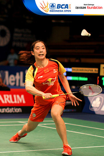 Wang Shixian (China) bersiap mengembalikan shuttlecock ke arah Busanan Ongbumrungpan (Thailand)
