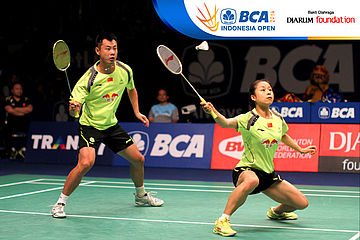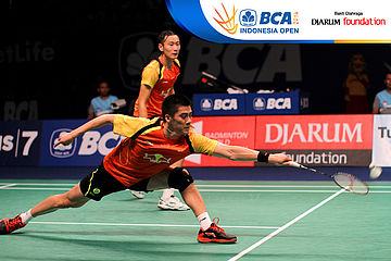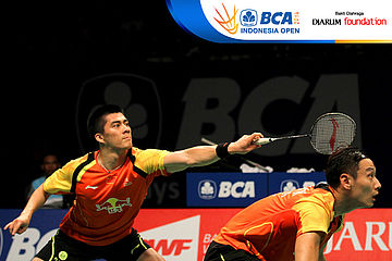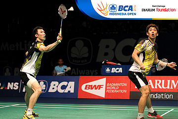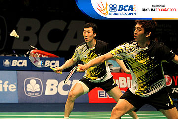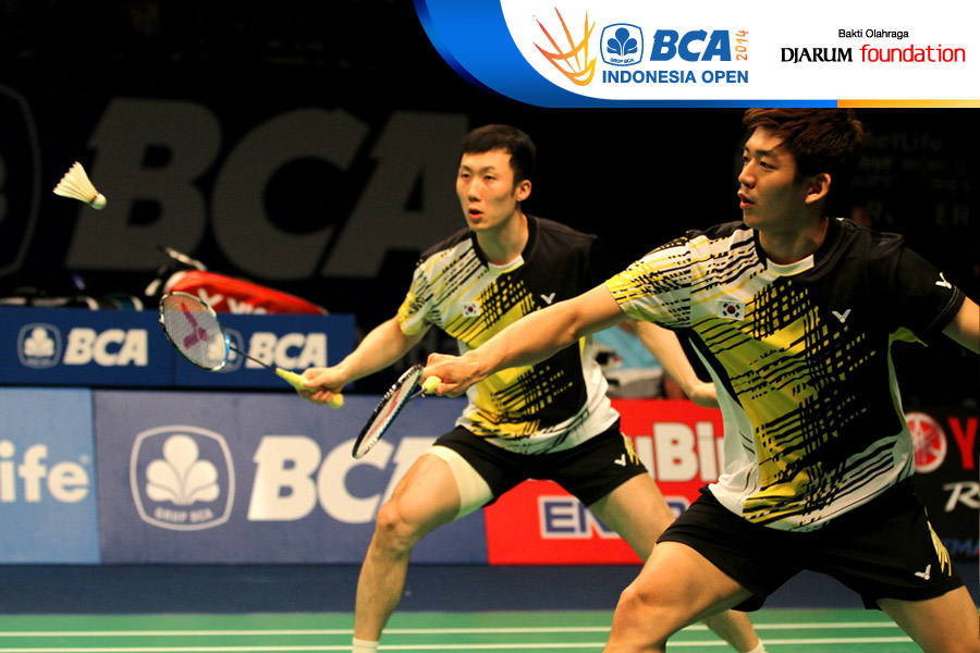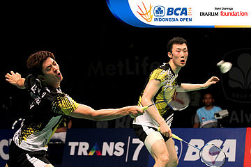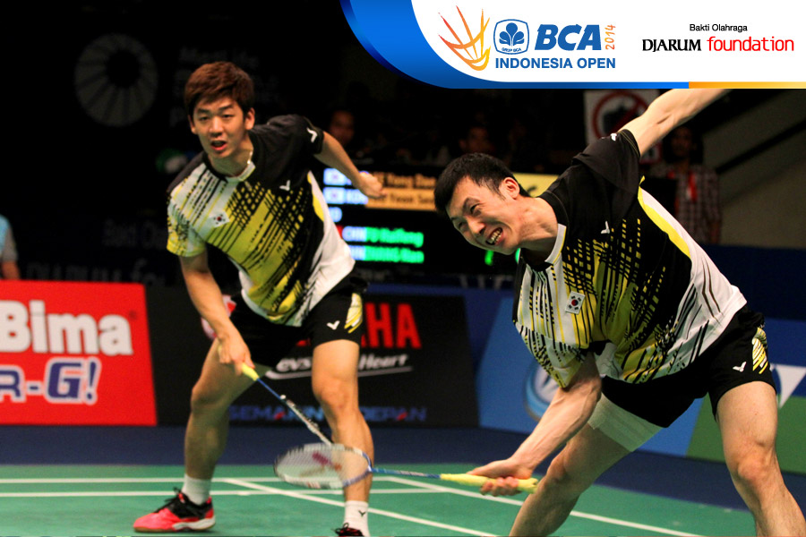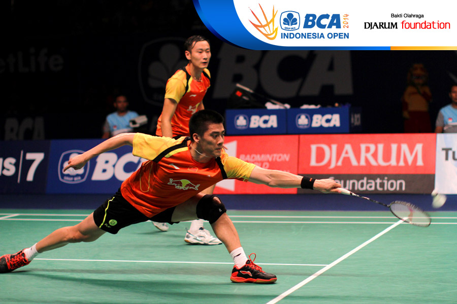 Fu Haifeng/Zhan Nang (China) mengembalikan shuttlecock ke arah Lee Yong Dae/Yoo Yeon Seong (Korea Selatan)