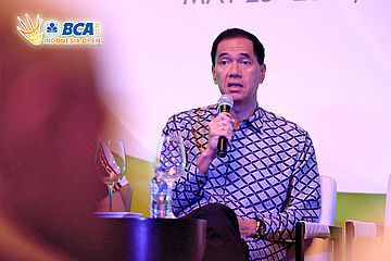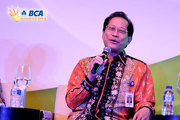 Gita Wirjawan, Ketua Umum Pengurus Pusat PBSI menjawab pertanyaan dari media.