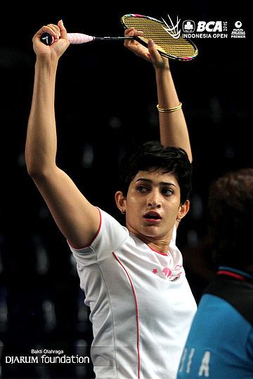 Ashwini Ponnappa (india) melakukan peregangan.