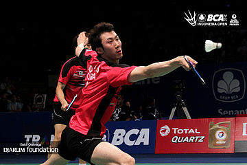 Lee Yong Dae/Yoo Yeon Seong (Korea) mengembalikan shuttlecock ke arah Agripina Prima/Markis Kido (Indonesia).