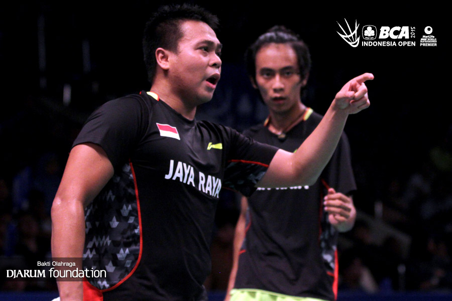 Ekspresi Agripina Prima/Markis Kido (Indonesia) saat berhasil mencuri poin.